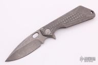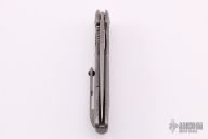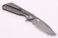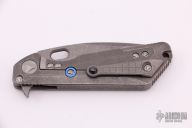 This MSG-3 by Mick Strider and Tony Marfione features an apocalyptic finished blade with notched thumbrest and flipper. The handle has a milled and apocalyptic finished integral titanium frame with tip up clip, clip has a ceramic ball, anodized titanium lockbar stabilizer, lanyard hole at the butt. Nice detent, lockup and blade seating. Dated 05/2016. Excellent condition. Comes with original box and papers.
