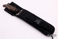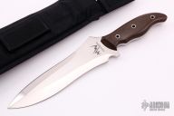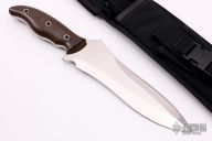 This Equatorian from Mercworx features a satin finish drop point, recurved blade with sharpened top edge and notched thumbramp, .250" blade stock and 2.503" blade depth, full tang construction. The handle is comprised of brown canvas micarta scales over full tang construction with hollow pins. Includes tactical nylon sheath. Excellent condition.