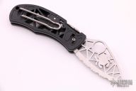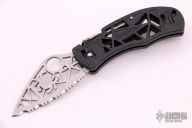 This Q Knife front-lock folder by Spyderco has a skeletonized satin finished stainless steel fully serrated blade with unique, clip-style front lock. Handle is black skeletonized polymer with 4-way reversible clip and lanyard hole. Excellent condition. Comes with original box and papers.