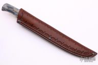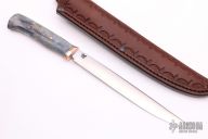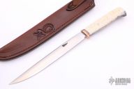 This Fillet by James Behring features a satin finished convex ground blade with .125" blade stock and .750" blade depth, hidden tang construction. The handle has a copper guard, premium fossil walrus ivory grip with black/copper/white spacers and a copper pin. Comes with a hand tooled brown leather sheath. New from maker.