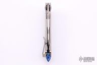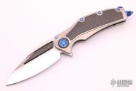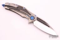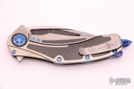 This Super Matrix-R by Marfione Custom Knives features mirror polished grinds, satin flats, and carbon fiber inlays that are floating, notched thumbrest and flipper. The handle has a satin finished titanium frame with seamless carbon fiber inlays and pivot collar, a satin finished titanium clip, tip up carry, and anodized titanium backspacer and hardware. Comes with a nylon zippered case, titanium dagger patch, original box and COA. Has dagger logo on clip. Dated 06/2017 and S/N 011. Excellent condition.