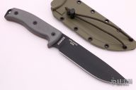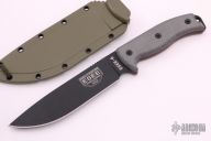 This Esee-6 features a black coated drop point blade with sharpened top edge and notched thumbrest, .194" blade stock and 1.538" blade depth. Scales are black linen micarta with red liners. Lanyard bail or skull crusher at but. Comes with green sheath and optional belt clip mount. Comes with original box and papers. Excellent condition.