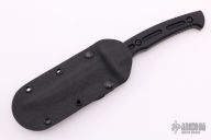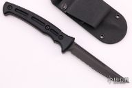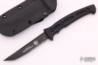 This Massad Ayoob "Razorback" by Masters of Defense has a black coated tanto partially serrated blade with fullers, .177" blade stock and .637" blade depth, hidden tang construction. The handle is black coated aluminum. Comes with a black kydex sheath. Excellent condition.