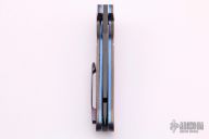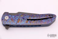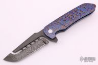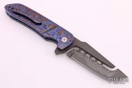 This Galileo Splitblade by Mike Nguyen features a low layer San Mai Damascus blade with CPM154 blade chassis. The handle has Black Triad Timascus tip up clip and scales with milled fluting, anodized titanium liners, floating San Mai Damascus backspacer. Rides on bearings, nice detent, lockup and blade seating. Comes with original case, excellent condition.