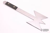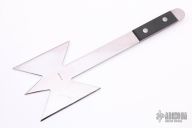 This throwing axe by Bobby Branton features a mirror polished blade, .122" blade stock and 5" from one blade edge to the other, full tang construction, black scales. Has some light scratches, otherwise excellent condition. #250 dated 1996.