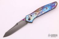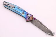 The Warren Osborne designed Benchmade 940 is a popular knife for good reason. It's a comfortable everyday carry knife with its slim design, great ergonomics and lightweight. The 940-1 has a premium CPM-S90V steel blade with a plain edge and a custom acid washed finish. The handle has custom anodized titanium scales done by Robert Durand, stainless steel liners and blue anodized aluminum barrel spacers. The AXIS lock makes the knife usable for right and left-handers. Comes with original box and papers. Excellent condition.