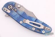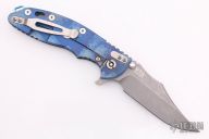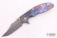 This XM-18 by Rick Hinderer features a working finished blade with notched thumbrest and flipper. The handle has a custom anodized titanium front scale, custom anodized titanium frame, custom anodized titanium backspacer (all ano done by Robert Durand), and a tip up or down reversible stonewash finished titanium clip and filler tab, lanyard hole at the butt. Excellent condition. Comes with original box and extra pivot hardware.
