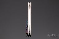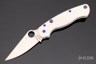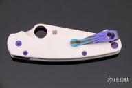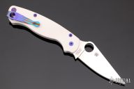This Paramilitary 2 Linerlock Folder from Spyderco has a satin finished clip point blade with thumb hole and notched thumb rest. Handle is white G-10 with stainless steel liners and a custom anodized deep carry titanium clip. Has anodized titanium hardware and added push button release. Comes with original box and papers. Excellent condition.