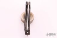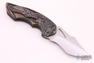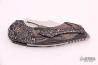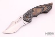 This Predator X by Greg Lightfoot features a satin finished recurve blade with asymmetrical swedge and thumbhole. The handle has Damascus bolsters, brown/tan/black G-10 over bead blasted titanium liners, stainless steel backspacer and tip up Damascus clip. Rides on bearings, nice lockup, detent, and blade seating. Comes with original box and COA dated Feb 2021. NEW FROM MAKER.