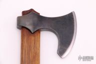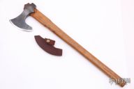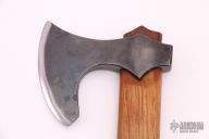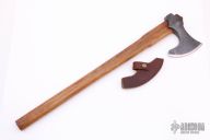 This Viking Hand Axe by Pawel Surdel features a hand forged head with hammer pole, 5.75" from pole to blade. Has a 23" hickory handle. Comes with a brown leather sheath. Excellent condition.