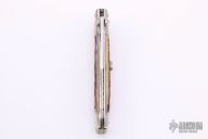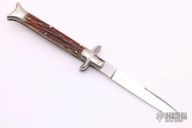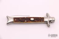 This vintage auto by Ohasseur Garantie France features a satin finished blade with false top edge. The handle has nickel silver bolsters, stag scales, steel liners and backspacer. Nice action and lockup, has a couple light scratches, otherwise excellent condition.