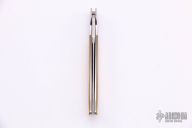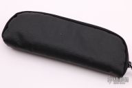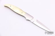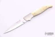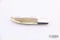 This knife by Larry Newton features a hand rub satin finished spear point blade with false top edge and a nail nick. The handle has satin finished stainless steel bolsters, gold lip pearl scales, stainless steel liners and backspacer. Nice lockup and blade seating. Has a few light scratches, otherwise excellent condition. Comes with a zippered case.