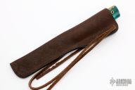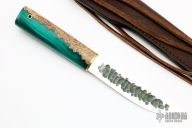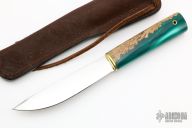 This Yakut Knife blade from Markin Aleksey of Heritage Blades features a mirror polished chisel ground blade with hammer marked fuller on the b-side, .148" blade stock and 1.103" blade depth, hidden tang construction. The handle is comprised of brass guard and resin and curly birch burl grip with a lanyard hole in pommel. Includes leather sheath. Excellent condition.