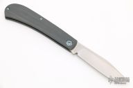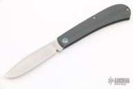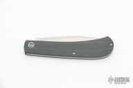 This Gatortooth slipjoint by Gatorbud and Alphahunter features a blasted clip point AEB-L blade with false top edge, has half-stop, flush in all positions. The handle has grey G-10 covers , blasted stainless steel spring and titanium hardware. Comes with a leather pouch. Excellent condition.