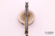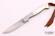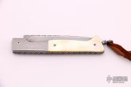 This sole-authorship custom lockback by Jerry Rados features a Turkish Damascus blade with fileworked blade spine. The handle has Turkish Damascus fluted bolsters with integral liners, liners have fileworked edges, gold lip pearl scales, and a matching Damascus backspacer with filework. Beautiful materials. Excellent condition.