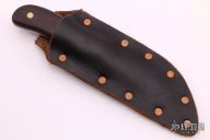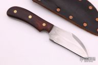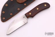 This knife by Jeff Morgan features a satin finished sheepsfoot blade, .147" blade stock and 1.366" blade depth, full tang construction. The handle has wood scales with Brass pins. Comes with brown leather sheath. Excellent condition.