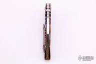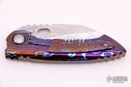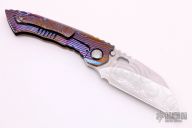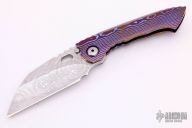This Mars from Dalibor Bergam features a Damasteel blade with notched thumbrest and thumbhole. The integral handle is comprised of heat colored mokuti with a matching pocket clip positioned for tip up carry. Has a Damasteel Pivot and zirconium pivot collars. The blade is centered when closed, opens/closes smoothly, and locks up with absolutely no play. Excellent condition.