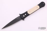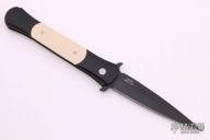 "Classic styling, modern 3D CNC Machining, and unequaled craftsmanship have all come together perfectly for our newest auto knife ? THE DON. The frames and inlays for each DON are completely 3D machined, curved and fluted for a completely custom feel. Super smooth coil spring action! Because of the complex machining and amount of detailed hand work involved with the DON, their production will be very limited each year." This large Don features a black blade and anodized aluminum frame with ivory micarta inlays. Includes original box and papers.  Excellent Condition.