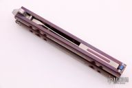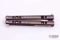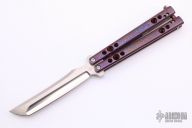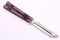 This Balisong by Shawn Greacen of Balibalistic features a satin finished tanto blade. The handles are anodized titanium with mokuti inlays, two-tone anodized titanium backspacer and a mokuti T-latch. Has some light scratches, otherwise excellent condition.