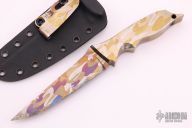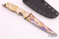 Our OTCS is fully constructed from 6Al-4V titanium, making this knife completely non-magnetic, non corrosive and super light weight for such a thick, strong handle. Each handle is hand contoured, fit and blended to the full custom hand ground blade, affixed with flush Ti pins for no snagging. The butt end features a thumb rest with jimping, allowing the knife to easily and comfortably be gripped in a standard or reverse grip. The blade has been given a ridiculously tough Titanium Carbide edge, with the hardness of 72 Rockwell! In addition to giving it a super strong edge, this gives the cutting surface a micro-serrated edge that just wants to bite hard into whatever it is cutting through! Each OTCS is hand built, and they are only being produced in a very limited run.
