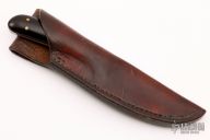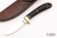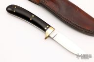 This knife by JB Fuchs features a hand rub satin finished blade with .203" blade stock and .747" blade depth, full tapered tang construction. The handle has a brass guard and dark ironwood scales with brass pins. Comes with a brown leather sheath. Has a couple light scratches, otherwise good condition. Has "79-21" on the blade. I'm guessing that means it was the 21st knife he made in 1979.