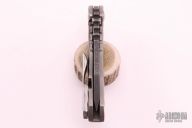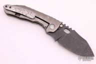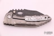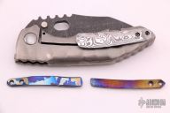 This Draco integral from Dalibor Bergam features an acid washed blade with the Multi-Grind, notched thumbrest and thumbhole. The handle is sculpted from a single piece of titanium that has then been orange peel finished and sculpted, Damasteel pivot, tip up Damasteel clip. This knife comes with the original sculpted titanium clip and a mokuti clip. The blade is centered when closed, opens/closes smoothly, and locks up with absolutely no play. This piece is in excellent condition. Comes with leather pouch by Sasa SF.