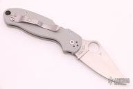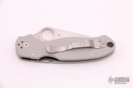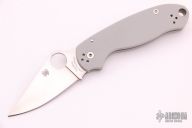 This Paramilitary 3 from Spyderco has a satin finished clip point blade with thumb hole and notched thumb rest. Handle is gray G10 with stainless steel liners and stainless steel 4-way reversible clip. Comes with original box and paperwork. Excellent condition.