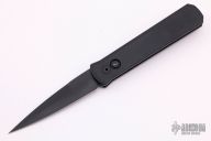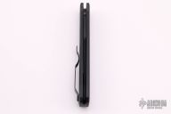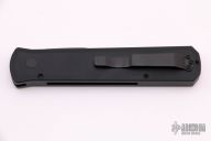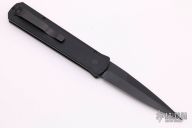 This knife features a black blade with notched thumbrest. The handle has a black aluminum frame with black hardware and black stainless steel tip up clip.  There is a lantern inlaid into the push button.  Comes with original box and papers. New from maker.