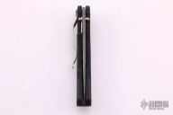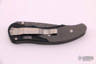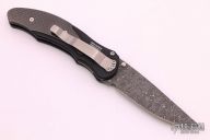 This Defiance by Pro-Tech Knives features a Chad Nichols Raindrop Damascus blade and black aluminum handle with carbon fiber inlays. Titanium tip down clip. Inlaid liner lock. Leaf spring. Fires by pressing a hidden button under the front end of the inlay. Dated 2010. Serial number 5. Has a couple of very light scratches on the clip, otherwise excellent condition.