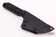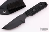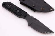 This Dub by Strider Knives features a black coated tanto style blade with notched thumbrest, .255" blade stock and 1.247" blade depth, full tang construction. The handle is comprised of black G-10 scales with milled frag pattern. Lanyard hole in pommel. Includes kydex sheath. Excellent condition.