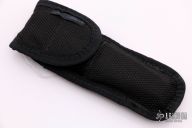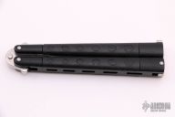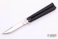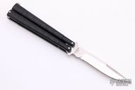 This Balisong by Benchmade features a polished Weehawk blade with false top edge. The handles are black with black plastic inlays. Excellent condition. Comes with velcro belt sheath.