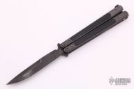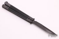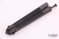 This Model 42-01 Prototype by Benchmade. It features a black spear point blade with swedge. The handles are black aluminum with black G-10 inlays with spring T latch on pommel. Marked "Prototype April 2003" on blade. Includes original box and papers. Has some scuffs, scratches, dings, wear on handle around latch, latch works in the open position, but not in the closed position, fair condition. A rare and hard to find piece.