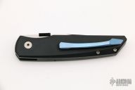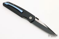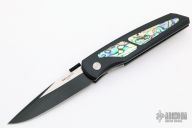 This Harkins D/A Auto linerlock folder has a two-tone stainless steel drop point blade with swedge and thumbdisc. Handle is black anodized aluminum with abalone inserts and anodized titanium tip up clip with hidden screws and orange peel finish. Excellent Condition. Comes with original box and papers.