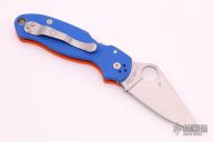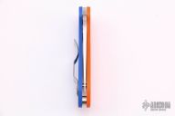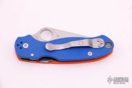 This Para 3 by Spyderco features a satin finished clip point REX45 blade with thumb hole and notched thumbrest. The handle is comprised of an orange and blue G-10 frame over nested steel liner and stand offs. The steel pocket clip is 4 way adjustable. Includes original box and paperwork. Excellent condition.