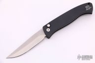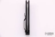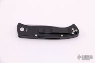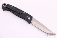 Stonewashed spear point blade with false top edge. The handle is black aluminum with a black stainless tip up clip. Comes with original box and papers.  PR6. Serial # 141. Scuffs and scratches are visible on the handle and spotting is visible blade spine.