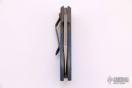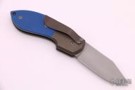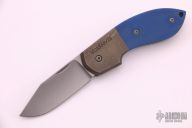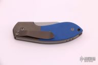 This slip joint by Vox Knives features a bead blasted blade with nail nick. The handle has an anodized and tumbled titanium frame with blue G-10 covers and stainless steel spring, tip down anodized and tumbled titanium clip. Has half-stop, flush in all positions. Has some scuffs, otherwise excellent condition.