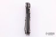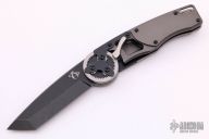This is a knife from the GH-Series Gearhead folding knife by Mantis Knives. The "steampunk-style" Gearhead liner lock folder is equipped with a unique gear-driven pivot with one large gear, three small gears and a thumb lever used to deploy the blade when pushed down. It features a flat 3.38" plain edge tanto blade and measures just under 5" when closed. The gray handle scales are made from aluminum with a stainless steel backspacer and tip-up pocket clip. The GH2020T Gearhead comes in a black stonewashed finished blade but is available in a variety of styles and finishes.