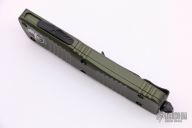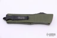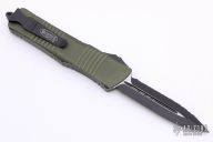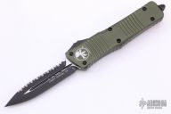 This Combat Troodon OTF automatic features a black D/E blade with one fully serrated edge and a OD Green aluminum frame. Stainless steel clip. Glass breaker. Serial number 28416 and dated 06/2020. Comes with original box and papers. New condition.