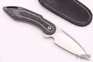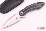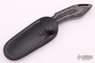 This Glimpse fixed blade by Begg Knives features a satin finished blade with false top edge and notched thumbrest. .140" blade stock and 1.122" blade depth, full tang construction. The handle has black/tan G-10 scales, textured tang, has lanyard hole. Comes with black leather slip sheath. Excellent condition.