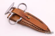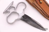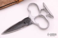 This Robbins of Dudley Push-Dagger by Ploughshare Forge features a black dagger blade with an aluminum knuckle grip. Comes with a brown leather sheath. Has black forge scale on the blade from heat treat, otherwise good condition.