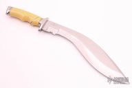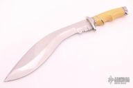 This Kukri by Ruffin Johnson features a mirror polish blade with .230" blade stock, 2.323" blade depth, hidden tang construction. The handle has a mirror polished stainless steel guard and butt, ivory paper micarta grip with black/aluminum spacers, wolf's head on the butt. Excellent fit and finish. Comes with a zippered case. Has a couple light scratches, otherwise excellent condition.