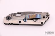 This SnG CC by Strider Knives features an acid tumbled blade and a black G10 and tumbled titanium handle, anodized tip up titanium clip. Notches on thumbrest, rear of handle, and lockup. Includes a Hinderer "Lock Bar Stabilizer" for maximum reverse lock retention. Not sure if this blade finish is original or not, I also think it has been resharpened, otherwise good condition.