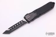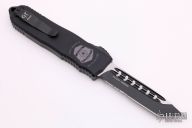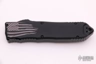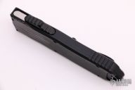 The Recon-Elite Double-Action Automatic has an overall length of 9.75” and a closed length of 5.625"". The 4.1" fine edge, Tanto-point blade is made of all Black finished ELMAX stainless steel. The dual, ventilated blood grooves on the blade allow for lightning fast deployment. The Black Type lll Hardcoat Anodized Aluminum handle is has top and bottom jimping for a non-slip grip. The black thumb slide rides on a stainless steel plate with ceramic balls to reduce friction. It features all black hardware with a black, serial numbered, reversible for right, or left hand pocket clip for tip-down carry. It also has a lanyard hole and hardened glass breaker tip.