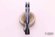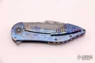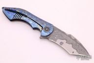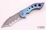 This Full Dress Flipper by the Fischer Bros features a San Mai Damascus tanto recurve blade with false top edge and notched flipper. The handle has a full timascus frame with custom pivot with timascus pivot collars, timascus tip up clip with hidden screws, timascus notched backspacer. Nice detent, lockup, action and blade seating, rides on bearings. Comes with zippered case. Excellent condition. Hard to come by!