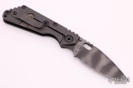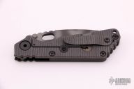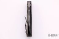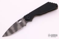 This SNG framelock folder by Mick Strider features a tiger stripe blade and a dimple pattern black aluminum and flamed titanium frame and tip up titanium clip. Includes a "Lock Bar Stabilizer" for maximum reverse lock retention. Nice detent, lockup and blade seating. Excellent condition.