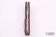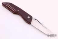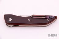 This Evolver 3.6 by Pieter Swanepoel features a hand rub satin finished tanto style blade with a swedge thumbhole and flipper. The handle has maroon/orange linen micarta scales, anodized titanium liners and tip up clip, stainless steel backspacer. Has some scratches, otherwise good condition.