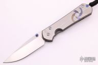 This Large Sebenza 31 by Chris Reeve Knives features a satin and tumble finished blade with notched thumbrest and single anodized titanium thumbstud. The handle has a bead blasted titanium frame with unique graphic, blue anodized titanium lanyard pin and bead. Comes with original box, sheath and papers dated June 18th, 2020. Excellent condition.