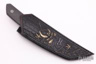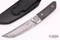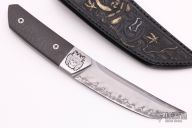 This Tanto EDC by CAS Knives features a San Mai blade with false top edge, .172" blade stock and 1.163" blade depth, full tapered tang construction. The handle has laser engraved stainless steel bolsters, carbon fiber scales with black canvas micarta liners, laser engraved stainless steel pins. Comes with a hand tooled and painted leather sheath and a leather zippered case. New from maker.