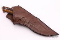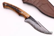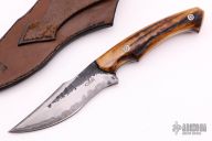 This Viper from the Sobral Brothers features their San Mai steel that has been forged into a beautiful finished product. Has a clip point recurve blade with a false top edge, .163" blade stock and 1.260" blade depth, full tapered tang construction. The handle features stag scales with black canvas micarta liners, stainless steel pins that have been laser engraved. Comes with a hand tooled brown leather sheath and a leather zippered case. New from maker.
