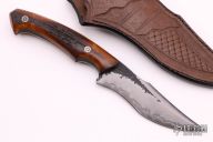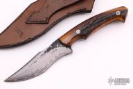 This Viper from the Sobral Brothers features their San Mai steel that has been forged into a beautiful finished product. Has a clip point recurve blade with a false top edge, .168" blade stock and 1.254" blade depth, full tapered tang construction. The handle features stag scales with black canvas micarta liners, stainless steel pins that have been laser engraved. Comes with a hand tooled brown leather sheath and a leather zippered case. New from maker.